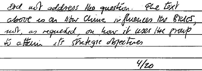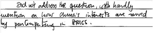 Muitos candidatos que, na ocasião, desenvolveram textos sobre os BRICS, de forma ampla, não atacando diretamente a questão dos interesses da China nos BRICS, não chegaram a ter nota zero em suas redações, mas tiveram notas de organização e desenvolvimento de texto muito baixas. Note os comentários do examinador: