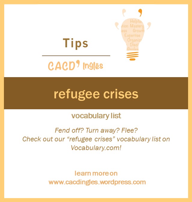 Vocabulary List | refugee crises Click here to access this vocabulary list! Cheers! Compartilhe isso: Clique para compartilhar no X(abre em nova janela) 18+ Clique para compartilhar no Facebook(abre em nova janela) Facebook Clique para compartilhar no Tumblr(abre em nova janela) Tumblr Clique para compartilhar no LinkedIn(abre em nova janela) LinkedIn Clique para enviar um link por e-mail para um amigo(abre em nova janela) E-mail Clique para compartilhar no PrintFriendly(abre em nova janela) PrintFriendly Curtir Carregando... Relacionado Posted In:VocabularyMarcado:vocabulary list