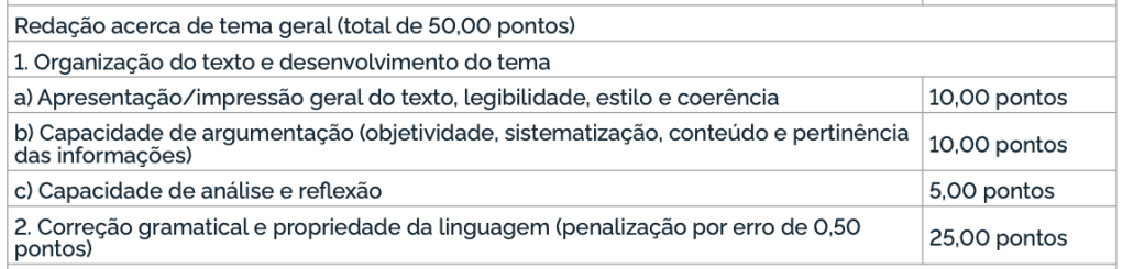 O que observamos na rubrica é que a tarefa vale um total de 50 pontos, 25 dos quais são referentes ao quesito “organização do texto e desenvolvimento do tema”, que é o nosso enfoque nesta análise. Esses 25 pontos são distribuídos em três subcritérios: o subcritério 1A, valendo 10 pontos, avalia “apresentação/impressão geral do texto, legibilidade, estilo e coerência”; o subcritério 1B, também valendo 10 pontos, avalia “capacidade de argumentação (objetividade, sistematização, conteúdo e pertinência das informações)”, e o subcritério 1C, valendo 5 pontos, avalia “capacidade de análise e reflexão”.